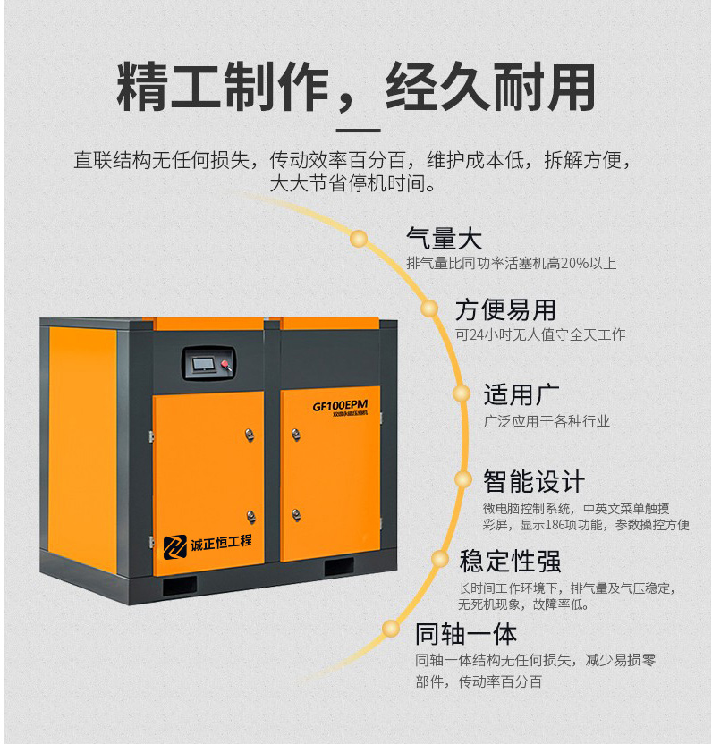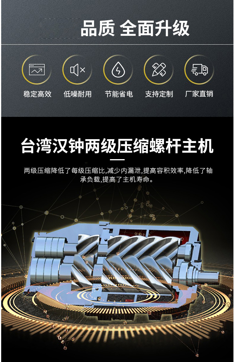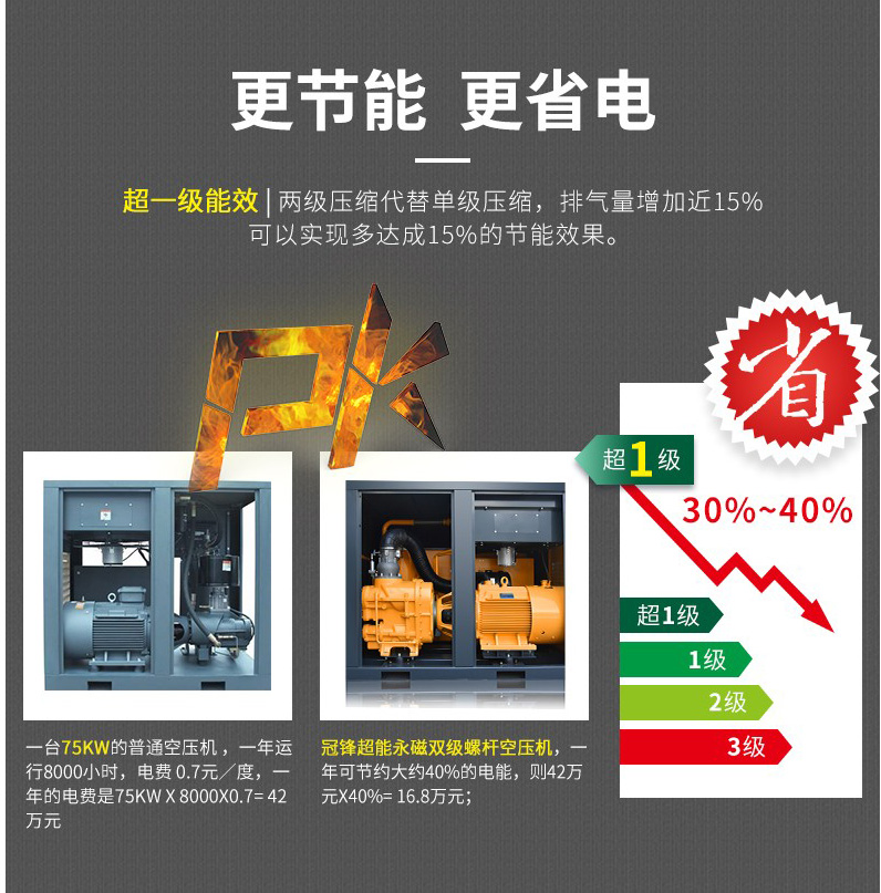 雙級壓縮主機更高效、更節能較雙螺桿空壓機節能高達35%以8000h/臺/年計算,每年可節約20萬元電費。