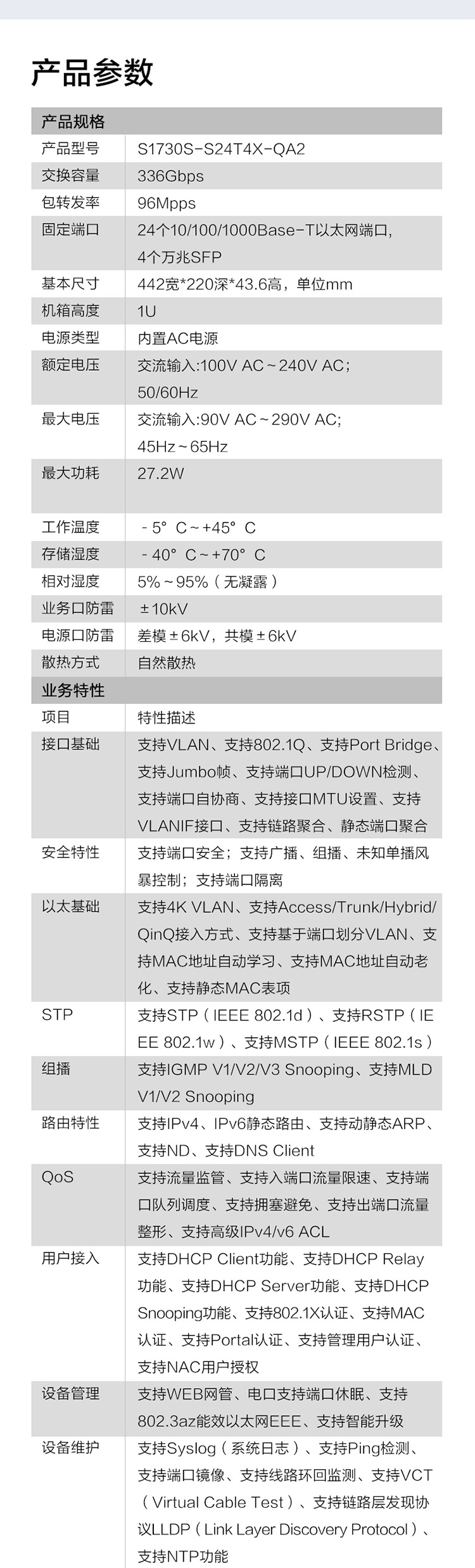 S1730S-S24T4X-QA2(24個10/100/1000BASE-T以太網端口,4個萬兆SFP+,交流供電) 交換容量336Gbps,包轉發率96Mpps,機架式,靜音款