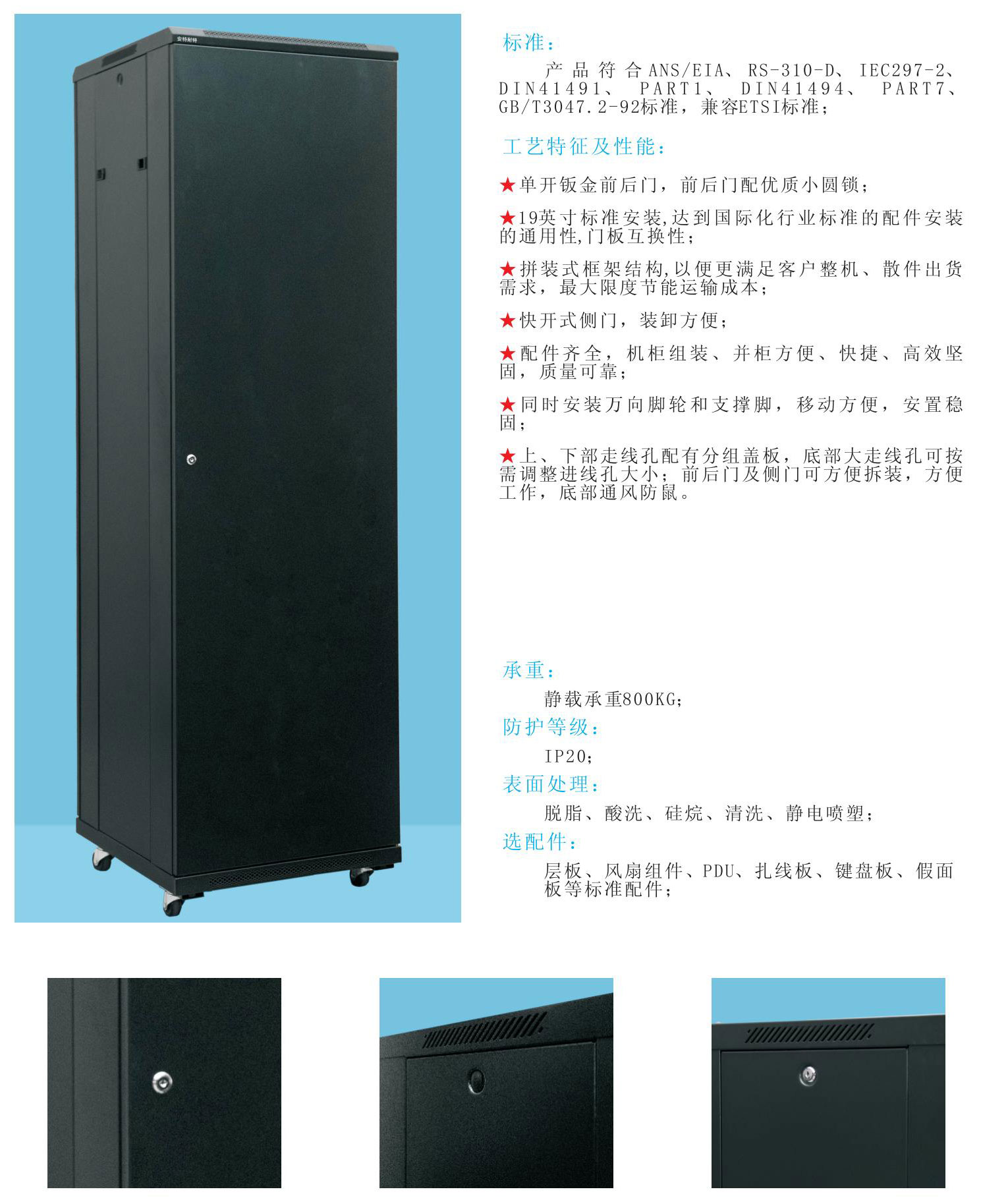 選配件:層板、風扇組件、PDU、扎線板、鍵盤板、假面板等標準配件;